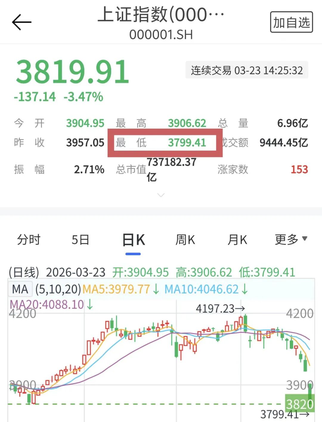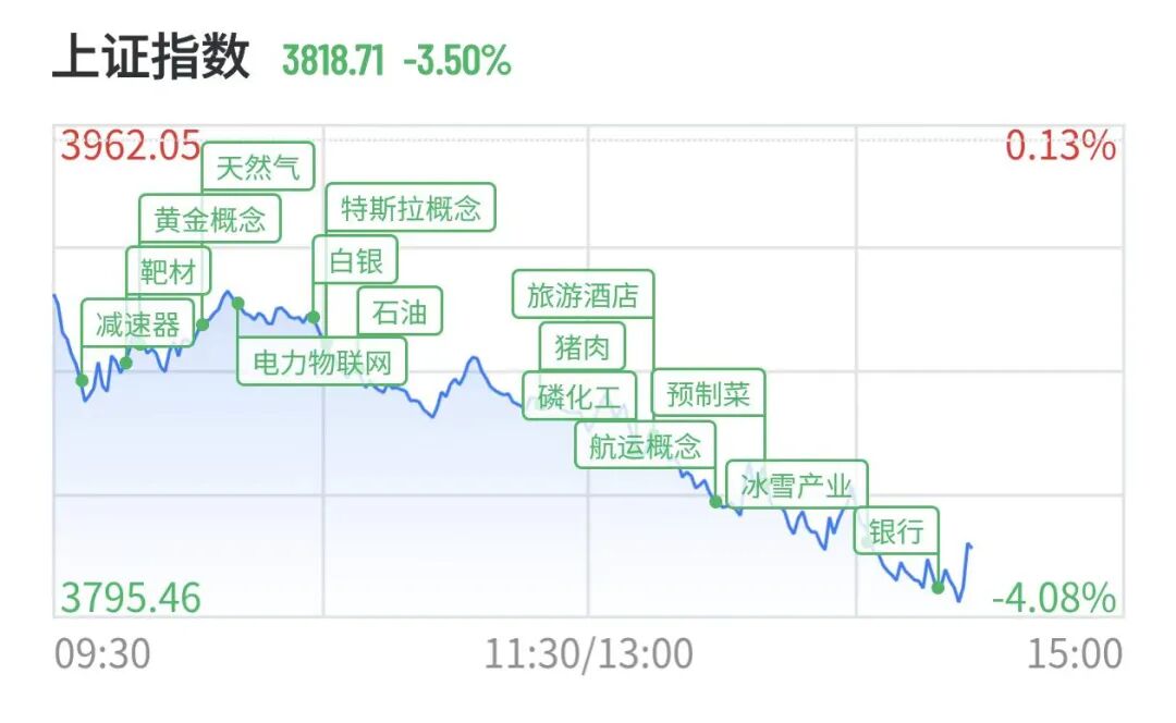 上证指数近期持续走低,23日午后跌幅扩大至4%,盘中跌破3800点,日内跌幅达157点,截至发稿报3819.91点。