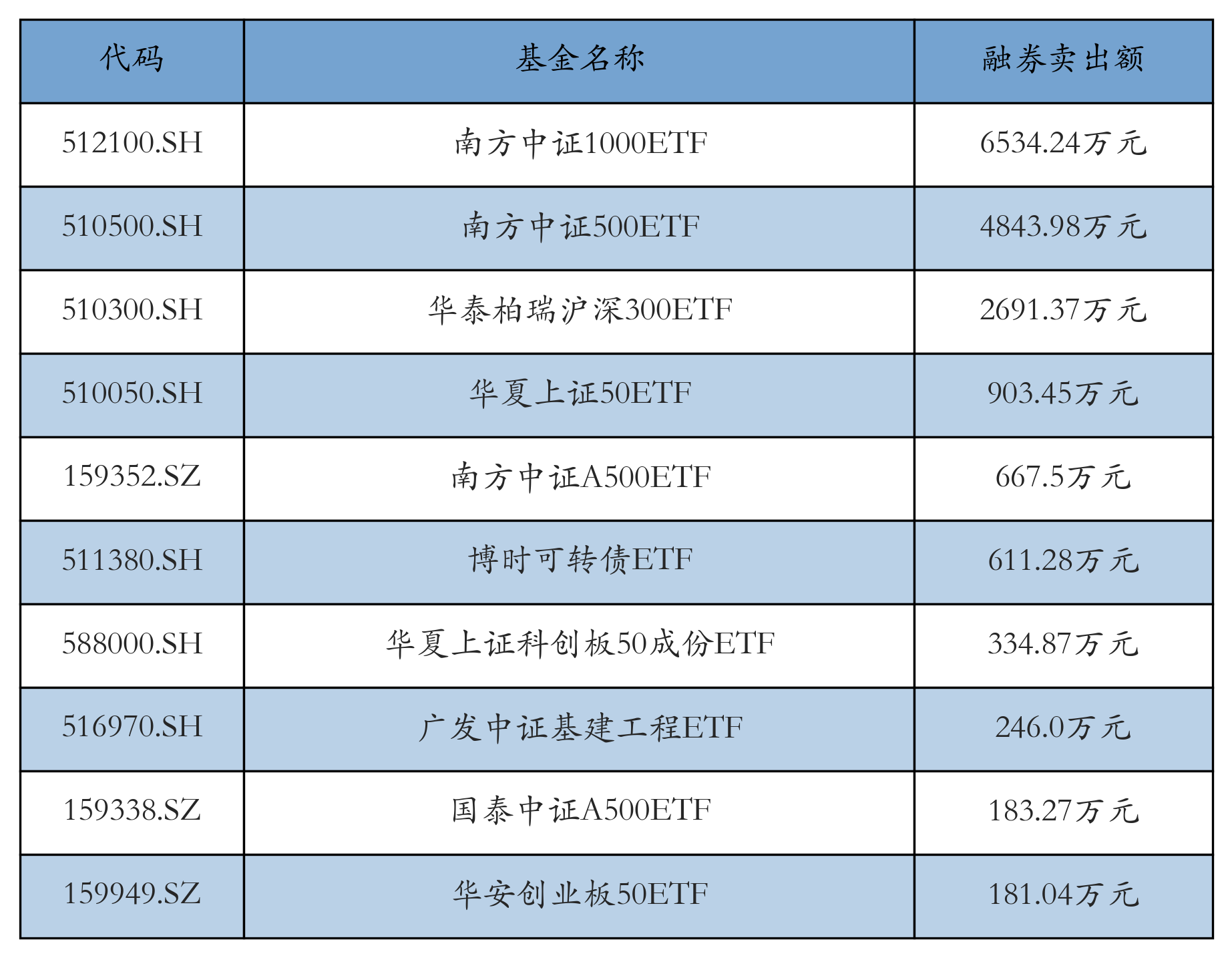 3月20日ETF融券卖出额前三位分别为:南方中证1000ETF(6534.24万元)、南方中证500ETF(4843.98万元)和华泰柏瑞沪深300ETF(2691.37万元),前10具体见下表: