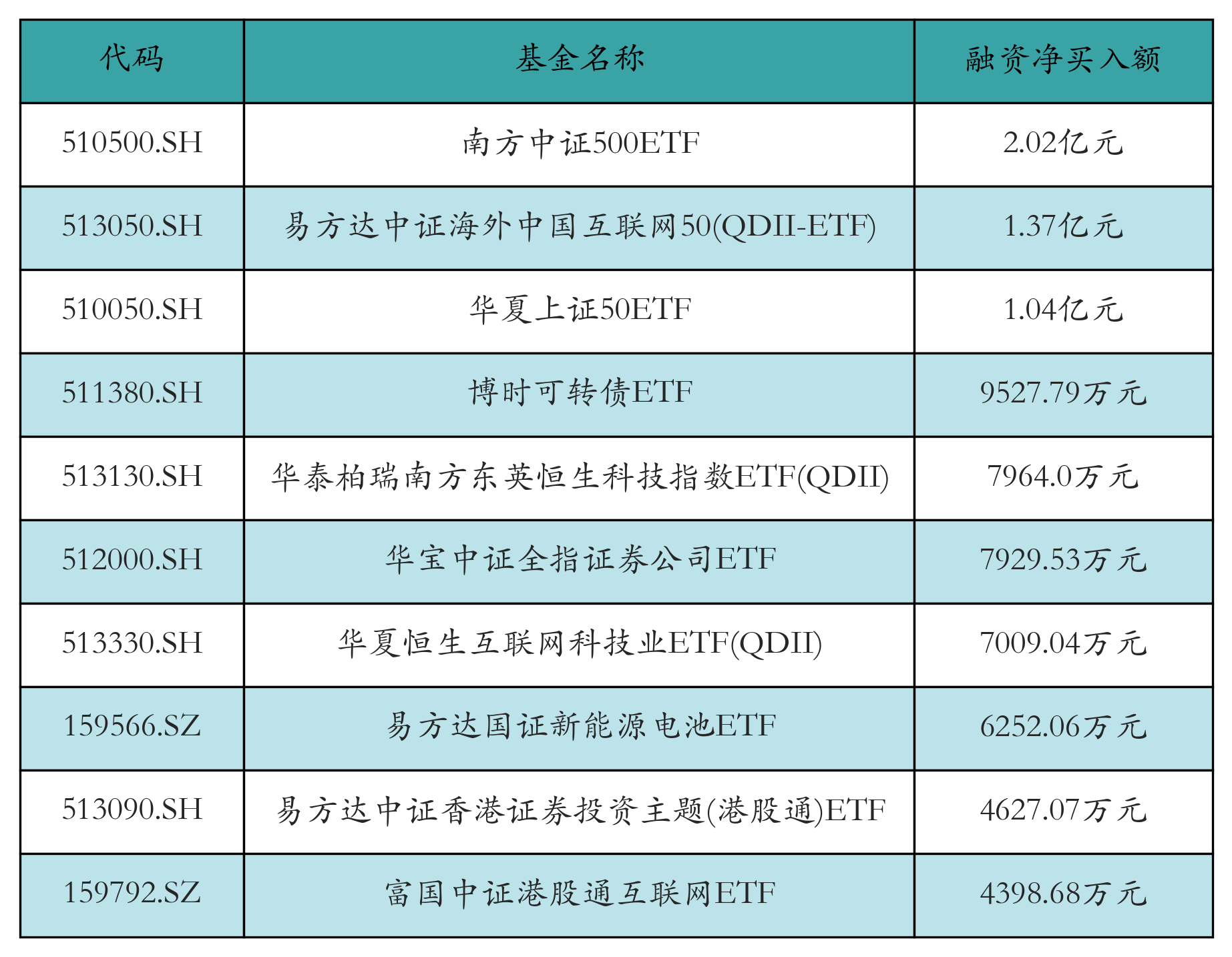 3月20日ETF融资净买入额前三位分别为:南方中证500ETF(2.02亿元)、易方达中证海外中国互联网50(QDII-ETF)(1.37亿元)和华夏上证50ETF(1.04亿元),前10具体见下表: