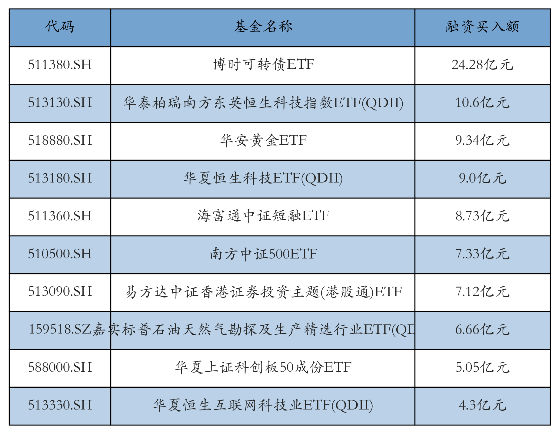 3月20日ETF融资买入额前三位分别为:博时可转债ETF(24.28亿元)、华泰柏瑞南方东英恒生科技指数ETF(QDII)(10.6亿元)和华安黄金ETF(9.34亿元),前10具体见下表: