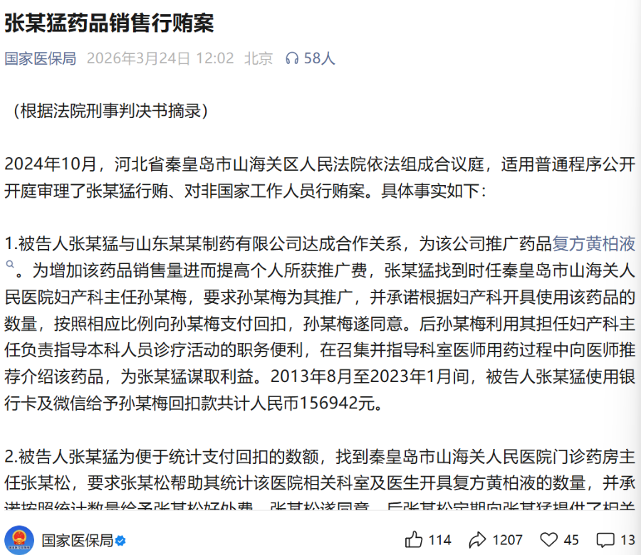 3月24日,国家医保局再次披露一起涉案金额更大、涉及人员更多的药品销售行贿案。