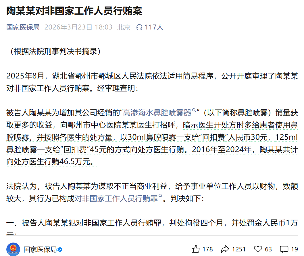 3月23日,国家医保局披露,湖北省鄂州市鄂城区人民法院于2025年8月适用简易程序,公开开庭审理了陶某某对非国家工作人员行贿案。