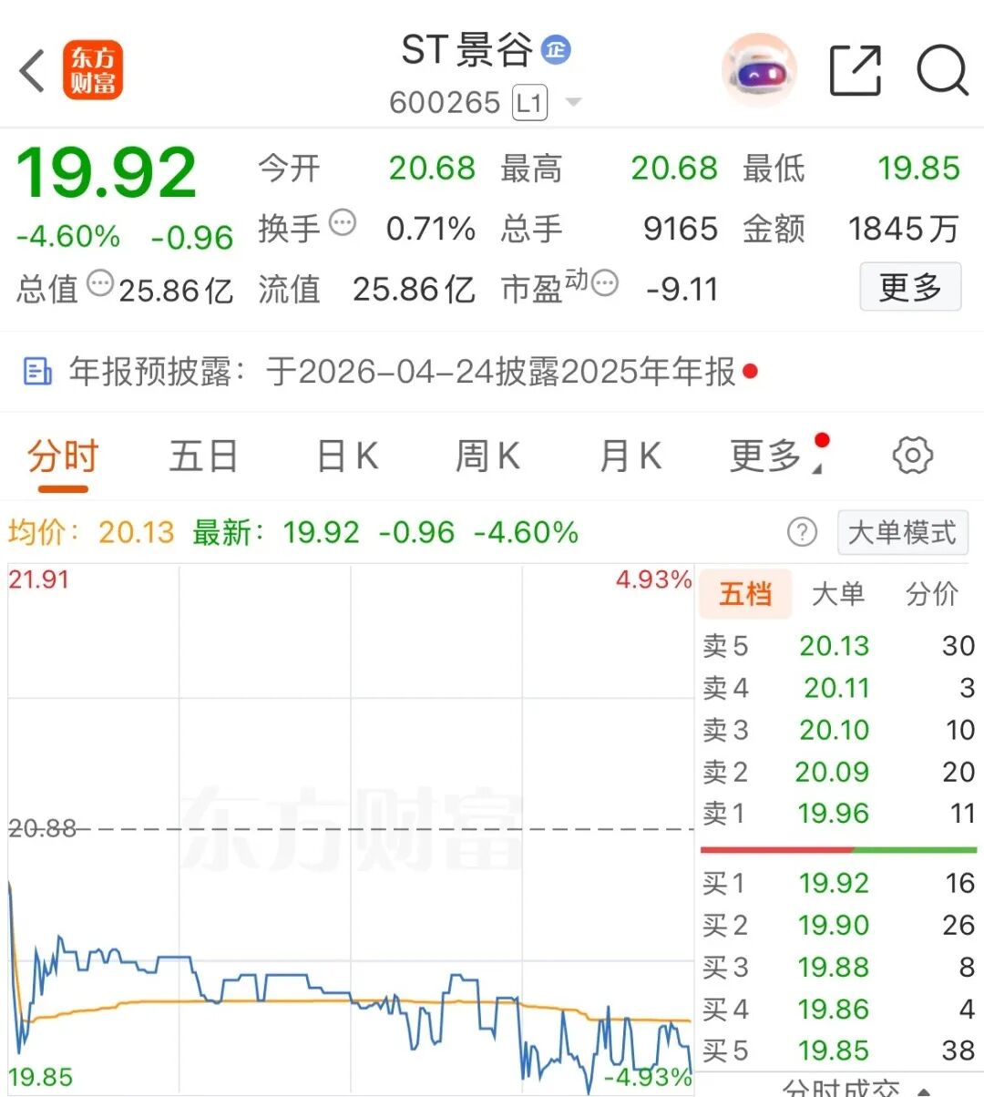 截至3月23日收盘,ST景谷报19.92元/股,跌幅4.60%。公司总市值为25.86亿元。