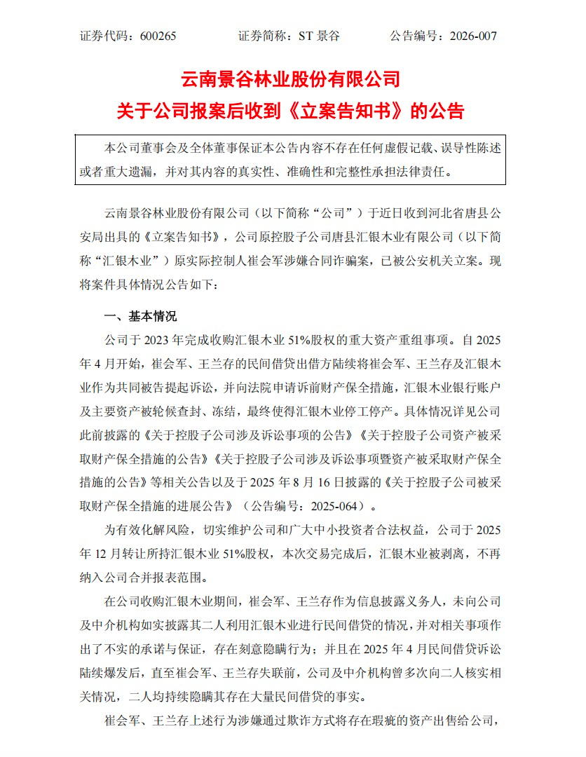 具体来看,ST景谷公告称,公司近日收到河北省唐县公安局出具的《立案告知书》,公司原控股子公司汇银木业的原实际控制人崔会军,因涉嫌合同诈骗案,已被公安机关正式立案。