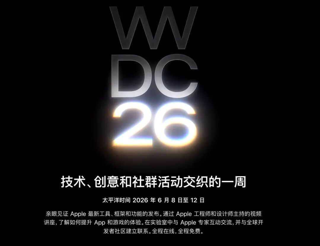 3月24日,苹果公司正式宣布,2026年全球开发者大会(WWDC 2026)将于当地时间6月8日至12日(北京时间6月9日至13日)举行。大会将延续线上线下结合的举办形式,6月8日开幕式当天将在Apple Park举办线下特别活动,邀请全球优秀开发者和工程师现场参与,同时面向全球开发者免费开放线上直播、视频讲座及互动实验室等环节。