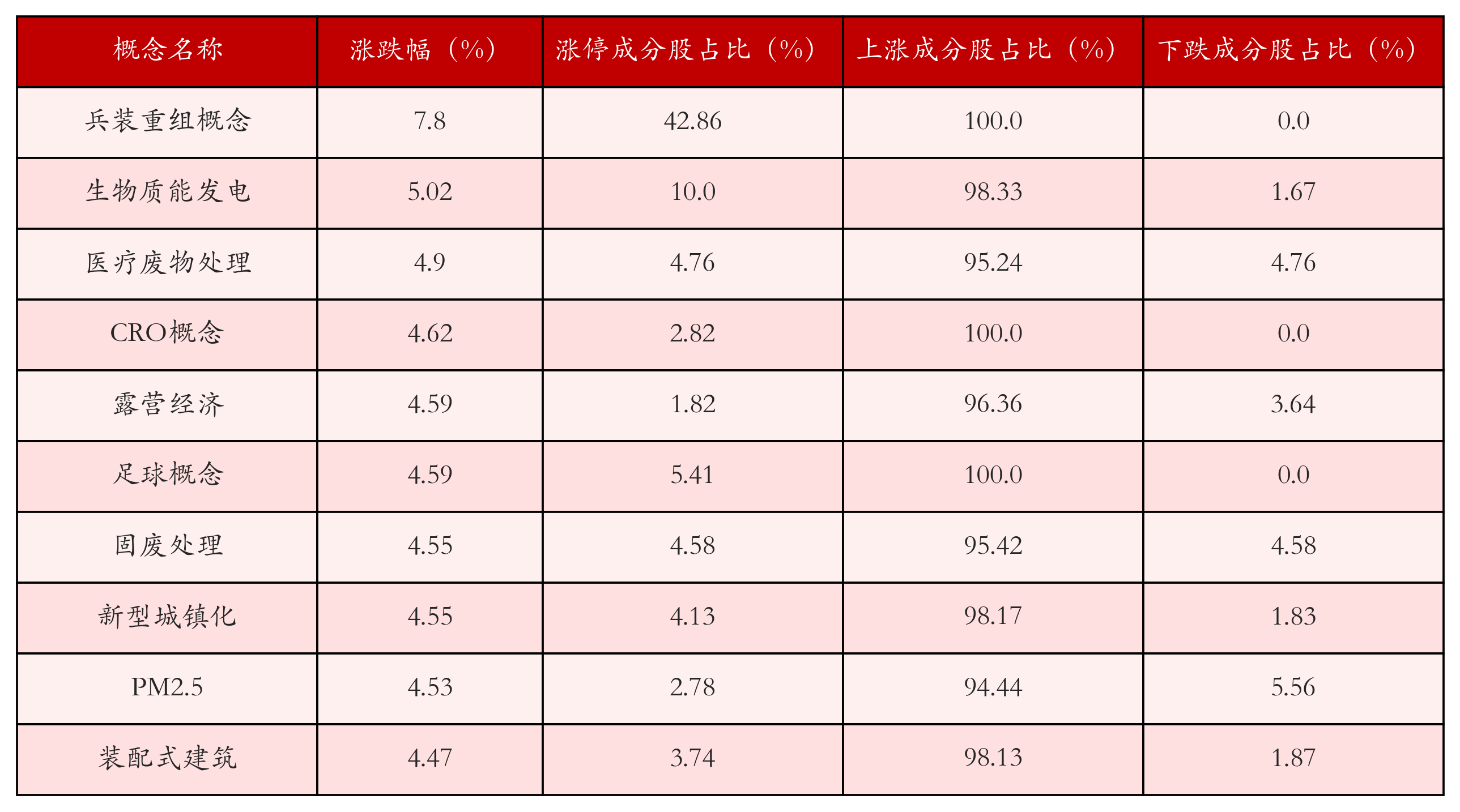 根据A股概念涨跌幅与所对应的股票池综合分析,涨幅靠前的三个概念板块分别为:兵装重组概念、生物质能发电与医疗废物处理。排名前10位的概念板块相关数据见下表:
