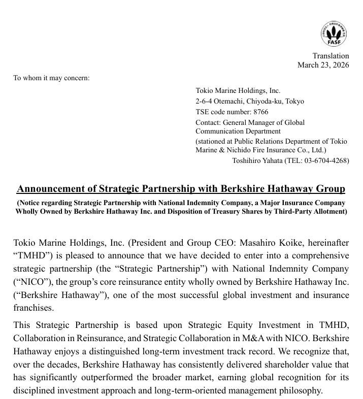 3月23日,东京海上控股发布公告称,公司将与伯克希尔建立全面战略合作伙伴关系。作为战略合作的基础,伯克希尔旗下核心再保险实体National Indemnity将收购东京海上控股已发行流通股2.49%的股份。交易金额为2874.1亿日元(约18.1亿美元),初始股份将通过处置东京海上控股持有的库存股份进行配售。