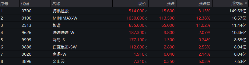 AI应用产业链板块上涨,MINIMAX-W涨超12%,智谱涨超11%,金山云涨超5%,腾讯控股涨超3%,阿里巴巴-W涨近3%。