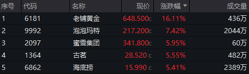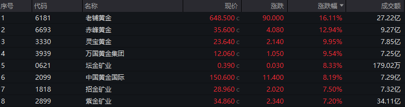 贵金属板块领涨,老铺黄金涨超16%,赤峰黄金涨近13%,万国黄金集团、灵宝黄金涨超9%。