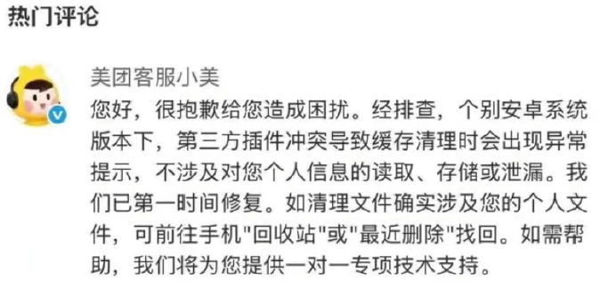 美团客服表示,此次问题仅发生在用户本地手机系统层面,美团App不会读取、存储或转移任何用户个人数据,用户隐私及账户信息均未受到影响。