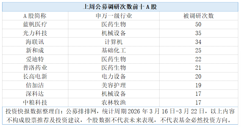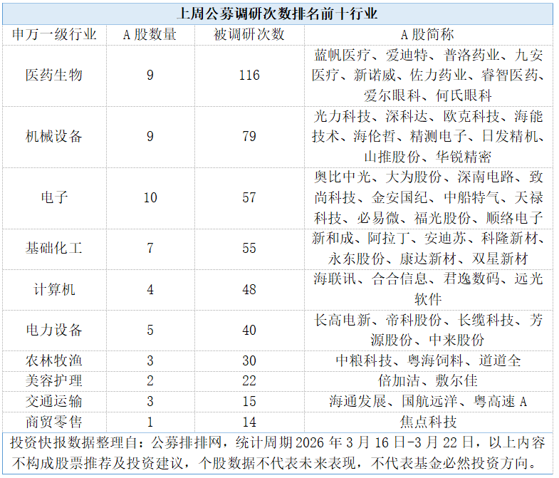 上周公募调研热情明显升温。投资快报记者从公募排排网数据梳理出,2026年3月16日-22日期间,共有119家公募机构参与到A股调研活动中,覆盖到23个申万一级行业中的70只个股,合计调研次数达570次。