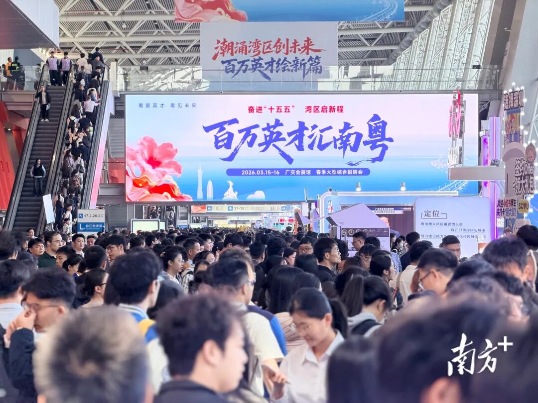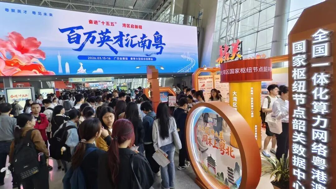 3月15日上午,由教育部和广东省委、省政府联合主办的“百万英才汇南粤”2026年春季大型综合招聘会在广州举行。
