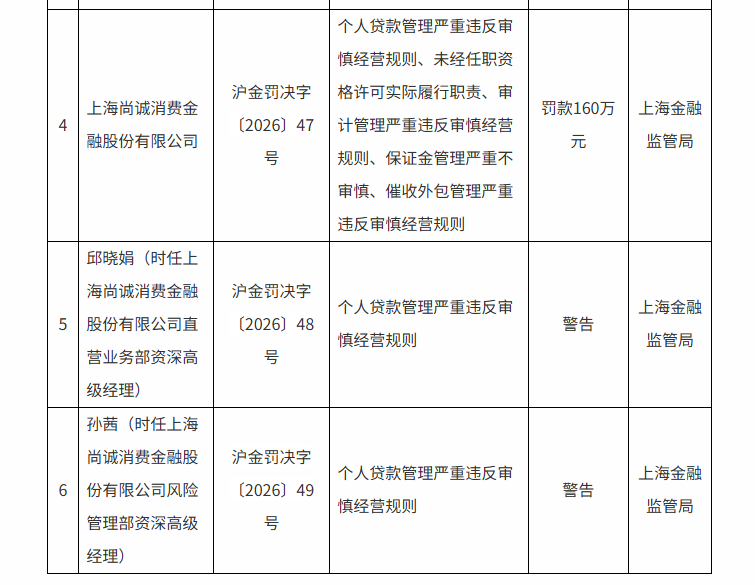 尚诚消费金融被罚款160万元,时任直营业务部资深高级经理、时任风险管理部资深高级经理两位员工,均因个人贷款管理严重违反审慎经营规则被警告。