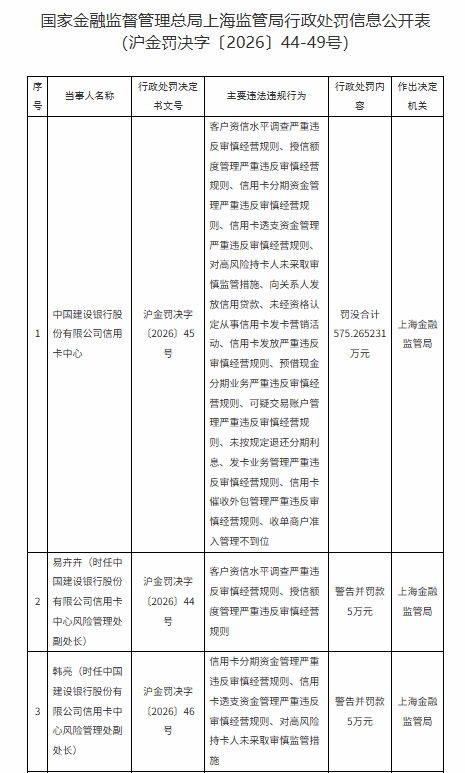 建行信用卡中心被罚没合计575万元,时任信用卡中心风险管理处的2位副处长分别被警告并罚款5万元。
