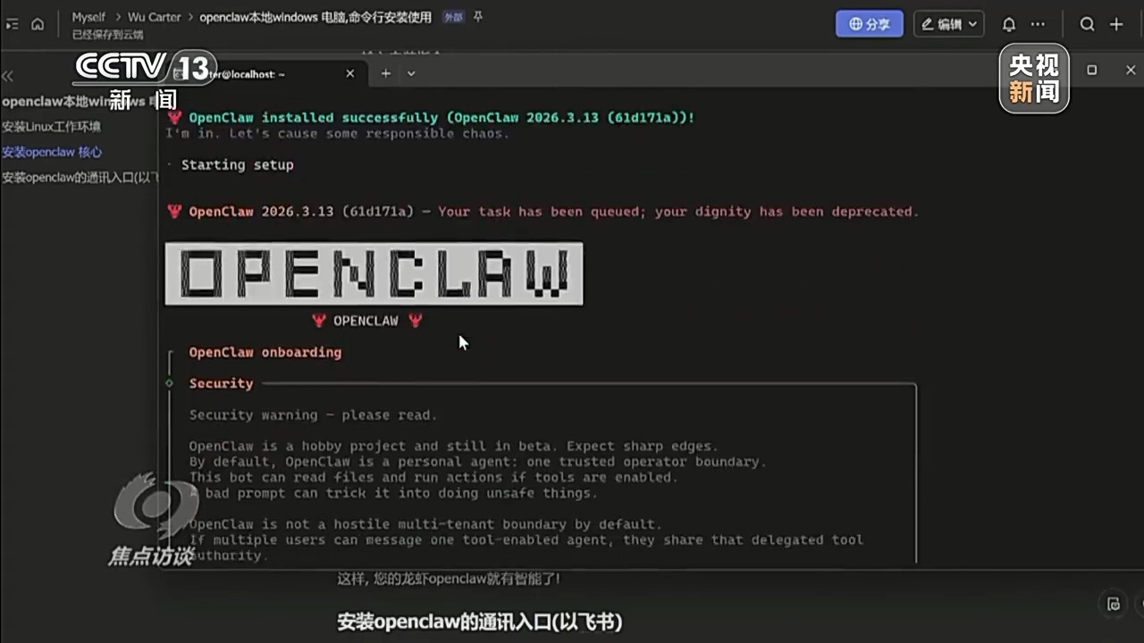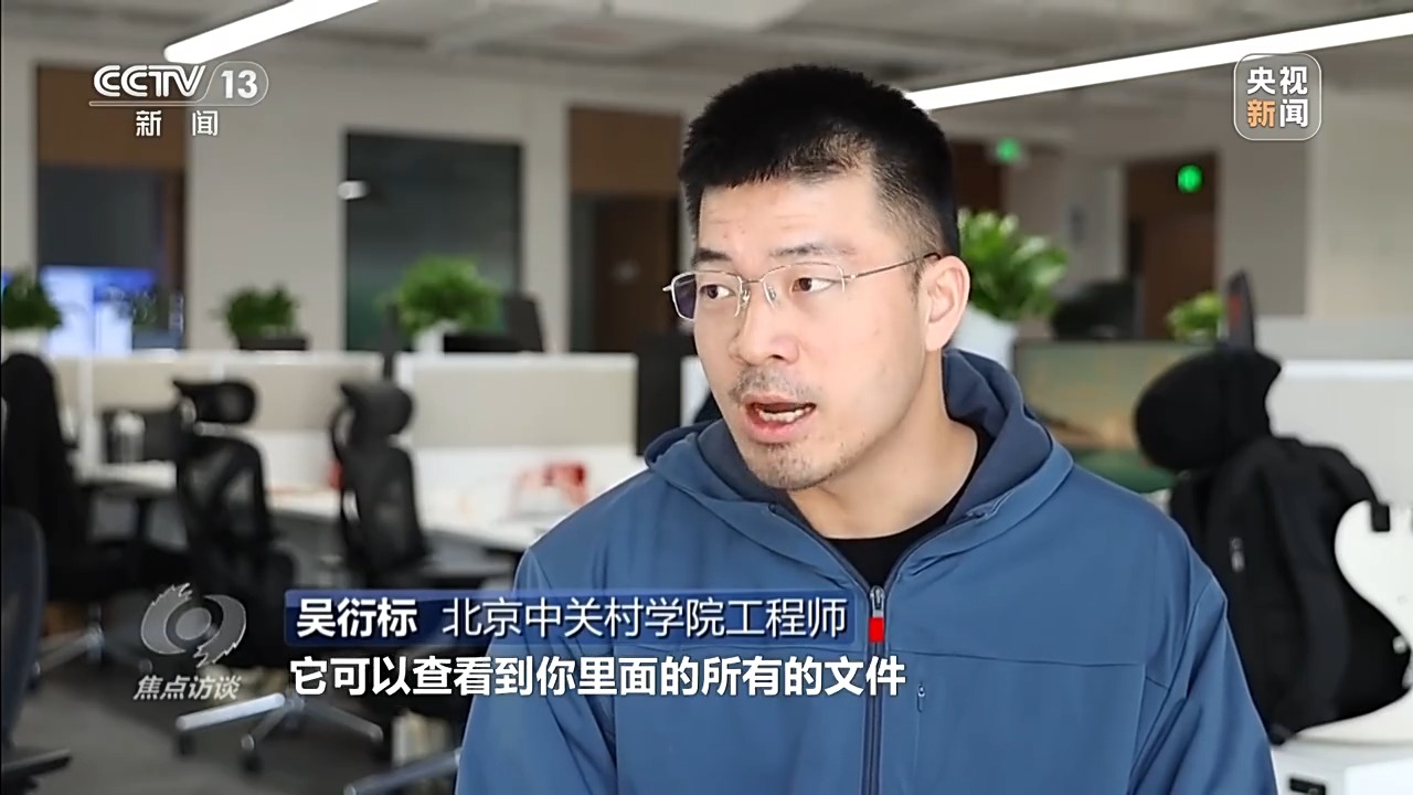 北京中关村学院工程师 吴衍标:安装了“龙虾”之后,它可以查看到电脑里面的所有文件,一旦有不法分子想利用这些漏洞,文件、机密都可能外传。