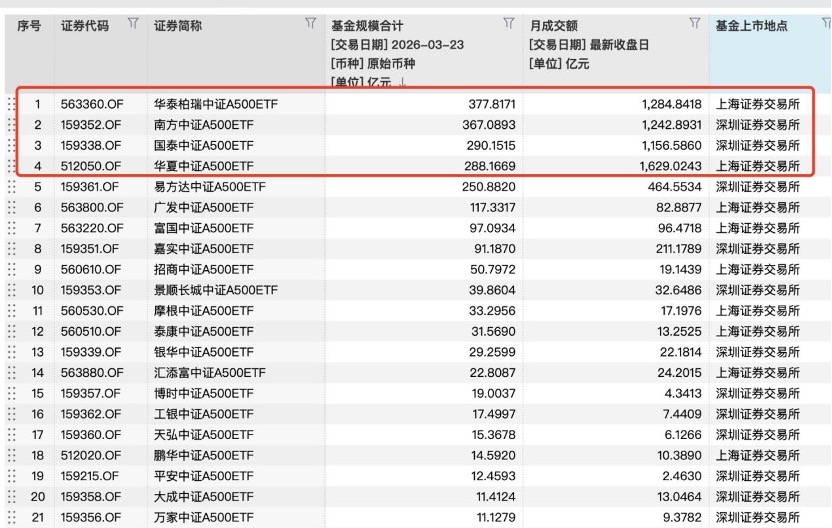 自从2025年10月,市场传出“两交易所各选1只中证A500ETF纳入期权标的”的消息后,每当季末,A500ETF的排位赛不可谓不激烈。不过,随着消息迟迟没有落地,竞争反而更加激烈了,排位战的战线越来越长,从每个季度最后一周,到现在进入3月以来,A500ETF成交额长期霸屏。