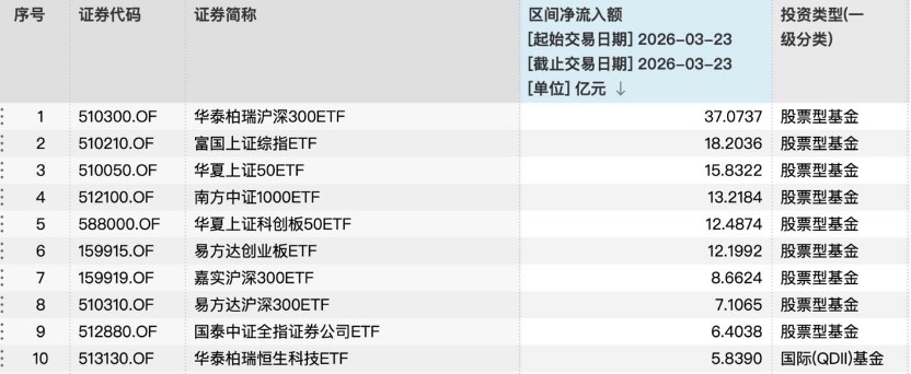 财联社记者统计显示,全市场ETF在3月23日逆市获得194亿元资金净流入。其中,宽基ETF成为抄底首选。沪深300ETF华泰柏瑞净流入超37亿元居首,上证综指ETF富国、华夏上证50ETF净流入分别为18.2亿元、15.8亿元;中证1000ETF南方、华夏科创板50ETF以及创业板ETF易方达净流入均超10亿元。