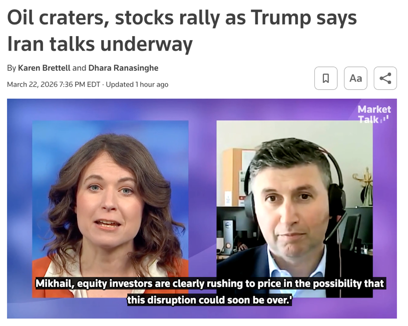 △路透社报道,特朗普总统透露美伊谈判正在进行后,油价大跌,股市上涨