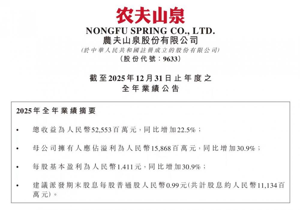近日,农夫山泉公布2025财年业绩。报告期内,公司营收525.53亿元,首次突破500亿元大关,增长22.5%。利润158.68亿元,增长30.9%。
