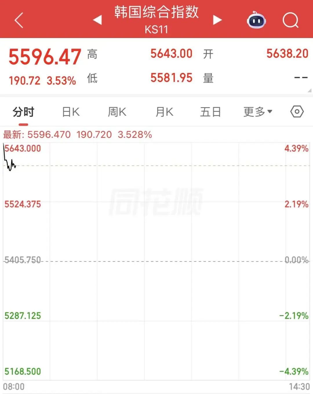 韩股方面,韩国综合指数开盘涨超4%,截至发稿,最新涨幅为3.53%,报5596.47点。热门个股中,SK海力士涨超6%。