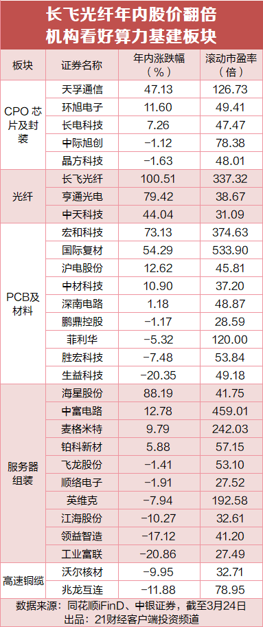 3月24日,A股光纤概念拉升,光纤龙头长飞光纤尾盘直线拉涨停,报233.31元/股,总市值为1932亿元,成交金额为43.21亿元,股价年内已实现翻倍。此外,通光线缆涨超10%领涨,腾景科技涨超9%股价创历史新高,新能泰山、云南锗业、福晶科技等多只概念股涨停,唯科科技、亨通光电、光库科技等多股涨超7%。