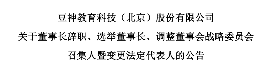 3月23日,豆神教育发布公告称,公司董事会于近日收到公司非独立董事、董事长窦昕的书面辞职报告。因工作安排调整,窦昕申请辞去公司第六届董事会非独立董事、董事长职务,亦不再担任公司第六届董事会战略委员会主任委员。