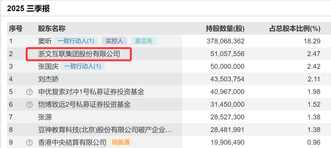 值得注意的是,2023年,豆神教育宣布破产重整,浙文互联出资1.33亿元受让了前者8853.35万股股份。截至2025年第三季度,浙文互联已成为豆神教育第二大股东。