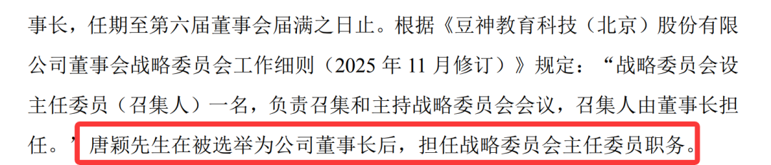 公告显示,2026年3月23日,豆神教育召开第六届董事会第十二次会议,审议通过了《关于选举公司董事长的议案》,公司董事会选举唐颖担任公司第六届董事会董事长,任期至第六届董事会届满之日止。根据相关规定,唐颖在被选举为公司董事长后,担任战略委员会主任委员职务。