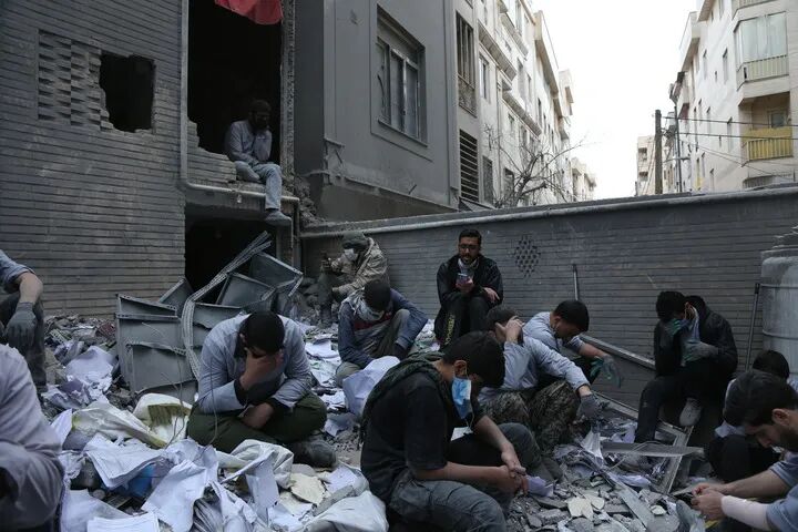 3月15日,在 伊朗 首都德黑兰的一处遇袭居民区,人们坐在一处建筑废墟上。 新华社记者 沙达提 摄