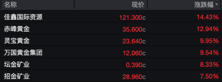 贵金属板块中,佳鑫国际资源(3858.HK)大涨14.43%,赤峰黄金(6693.HK)飙升12.94%,灵宝黄金(3330.HK)上涨9.95。