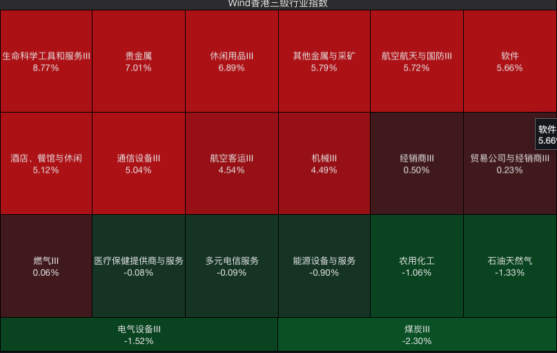 分板块来看,Wind香港三级行业指数中,贵金属与消费类板块领涨,生命科学工具和服务Ⅲ(+8.77%)、贵金属(+7.01%)、休闲用品Ⅲ(+6.89%)成为涨幅前三的板块;传统能源、周期板块承压,煤炭Ⅲ(-2.30%)、电气设备Ⅲ(-1.52%)石油天然气(-1.33%)为跌幅前三的板块。