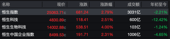 恒生指数收盘报25063.71点,涨2.79%,收复25000点整数关口,全天成交额达3030.73亿港元,较上一日有所回落。恒生科技指数表现同样亮眼,收涨2.51%至4830.89点,成交额约为600亿港元,亦出现缩量。