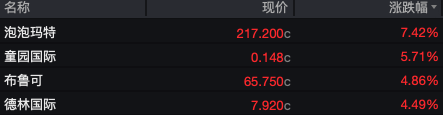 休闲用品为代表的消费板块中,泡泡玛特(9992.HK)作为板块龙头上涨7.42%,成交额达43.53亿港元,成为市场焦点。布鲁可(0325.HK)上涨4.86%,童园国际(3830.HK)上涨5.71%。