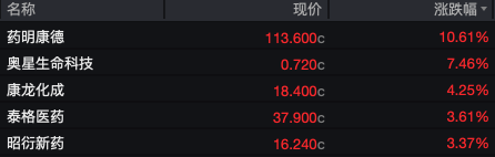 生物医药板块中,领涨个股包括药明康德(2359.HK,+10.61%)、康龙化成(3759.HK,+4.25%)和奥星生命科技(6118.HK,+7.46%)。