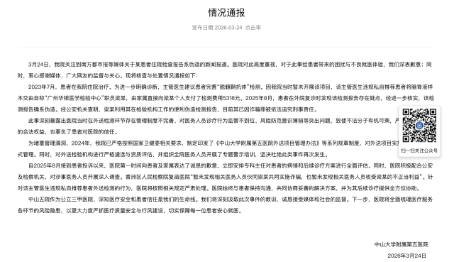 3月24日,中山大学附属第五医院就患者检查报告伪造事件发布情况通报。