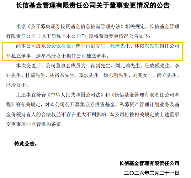 另外,长信基金同时公告了董事变更情况。经股东会会议决议,选举肖剑、杜琦、林裕东担任公司非独立董事,选举冯玲担任公司独立董事。