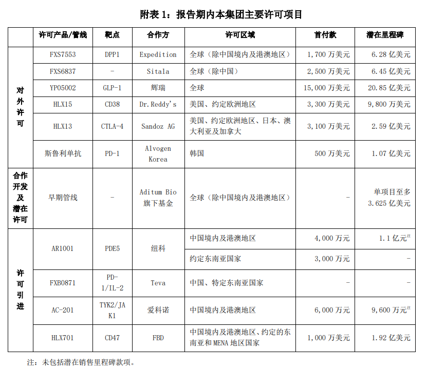 2025年,复星医药在BD交易与国际合作方面持续发力。报告期内累计对外许可/授权达6项,包括口服GLP-1药物YP05002、小分子抑制剂FXS6837、创新型单抗斯鲁利单抗注射液(抗PD-1单抗)等多个创新管线,合作方包括辉瑞等跨国药企。全年对外许可首付款总金额超2.6亿美元,潜在里程碑总金额超38亿美元。