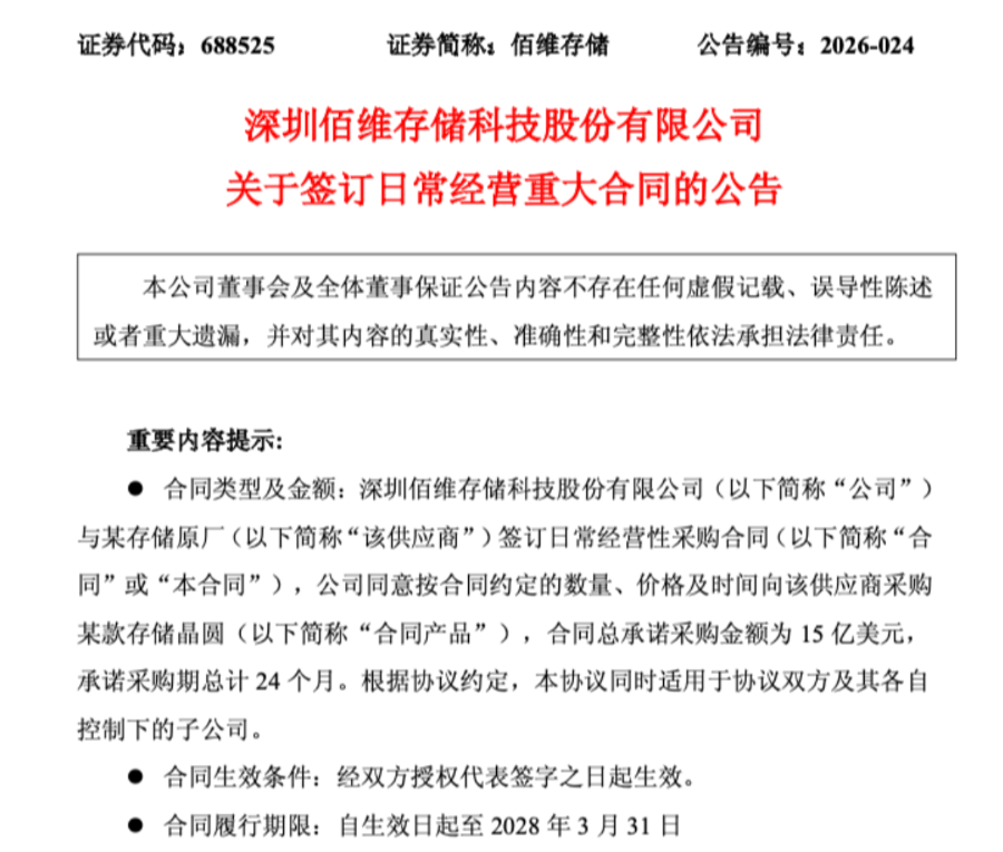 消息面上,3月24日,佰维存储发布公告称,公司与某存储原厂签订日常经营性采购合同,公司同意按合同约定的数量、价格及时间向该供应商采购某款存储晶圆,合同总承诺采购金额为15亿美元,承诺采购期总计24个月。