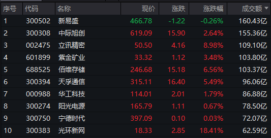 个股方面,新易盛成交额超160亿元居首,中际旭创、立讯精密、紫金矿业成交额靠前。