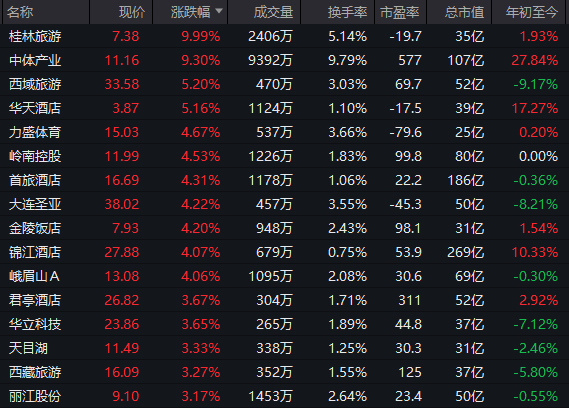 旅游概念股异动拉升,桂林旅游盘中直线拉涨停,中体产业、西域旅游、华天酒店等跟涨。