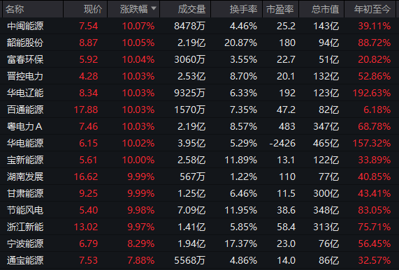 绿电板块强势走高,华电辽能实现8连板,中闽能源、韶能股份、富春环保、晋控电力等多股涨停。