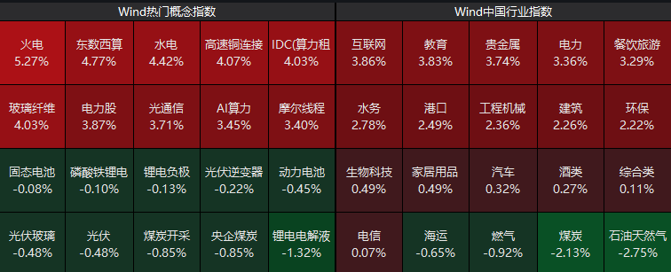 板块上来看,绿电板块强势走高,贵金属、餐饮旅游、算力等方向涨幅居前;而石油天然气、煤炭、光伏等板块震荡调整。个股方面,超4500只个股上涨。