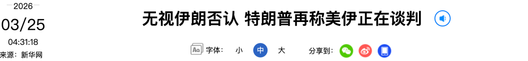 特朗普23日对媒体说,美国同伊朗进行了对话,已形成协议要点。但伊朗伊斯兰议会议长卡利巴夫23日在社交媒体发文,否认与美国进行任何谈判。卡利巴夫称,散布“虚假新闻的目的是操纵金融和石油市场,以此让美国和以色列摆脱其深陷的泥潭”。
