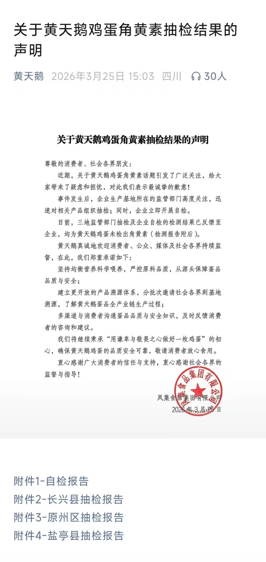 在此次的声明发布中也附带了自检、长兴县、原州区及盐亭县四份检测报告,“均为黄天鹅鸡蛋未检出角黄素。”