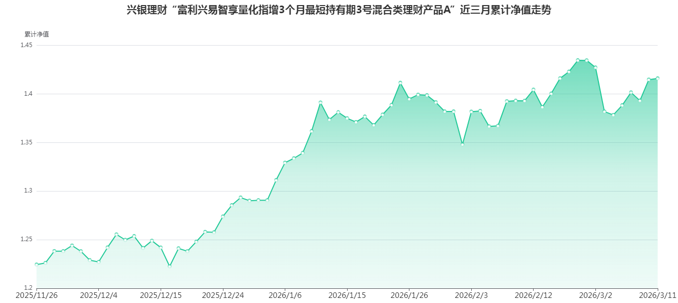 作为量化指增系列产品,“富利兴易智享量化指增3个月最短持有期3号混合类理财产品A”采取量化选股策略,精选优秀管理人运作。产品将量化选股与衍生品工具相结合,在紧密跟踪标的指数的基础上,通过分散配置股票、衍生品等多元资产及灵活交易策略,力争实现长期稳健的超额收益。截至2026年3月11日,产品成立以来净值涨幅达到41.60%,表现亮眼。