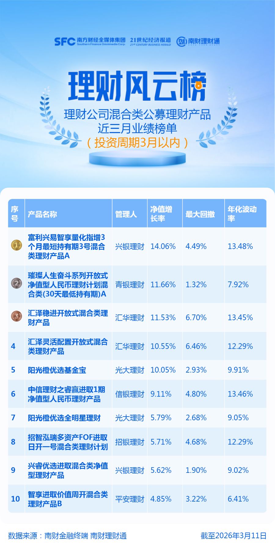 榜单数据说明:统计对象为理财公司发行的投资封闭期在3个月以内(含)的公募混合类产品,同系列同投资周期产品保留一只,统计区间为近三月,截至时间为2026年3月11日。理财产品数据来源于南财理财通(https://newgym.sfccn.com/),股票数据来源于Wind。榜单排名由理财通AI全自动化实时排名,如您对数据有疑问,请在文末联系助理进一步核实。