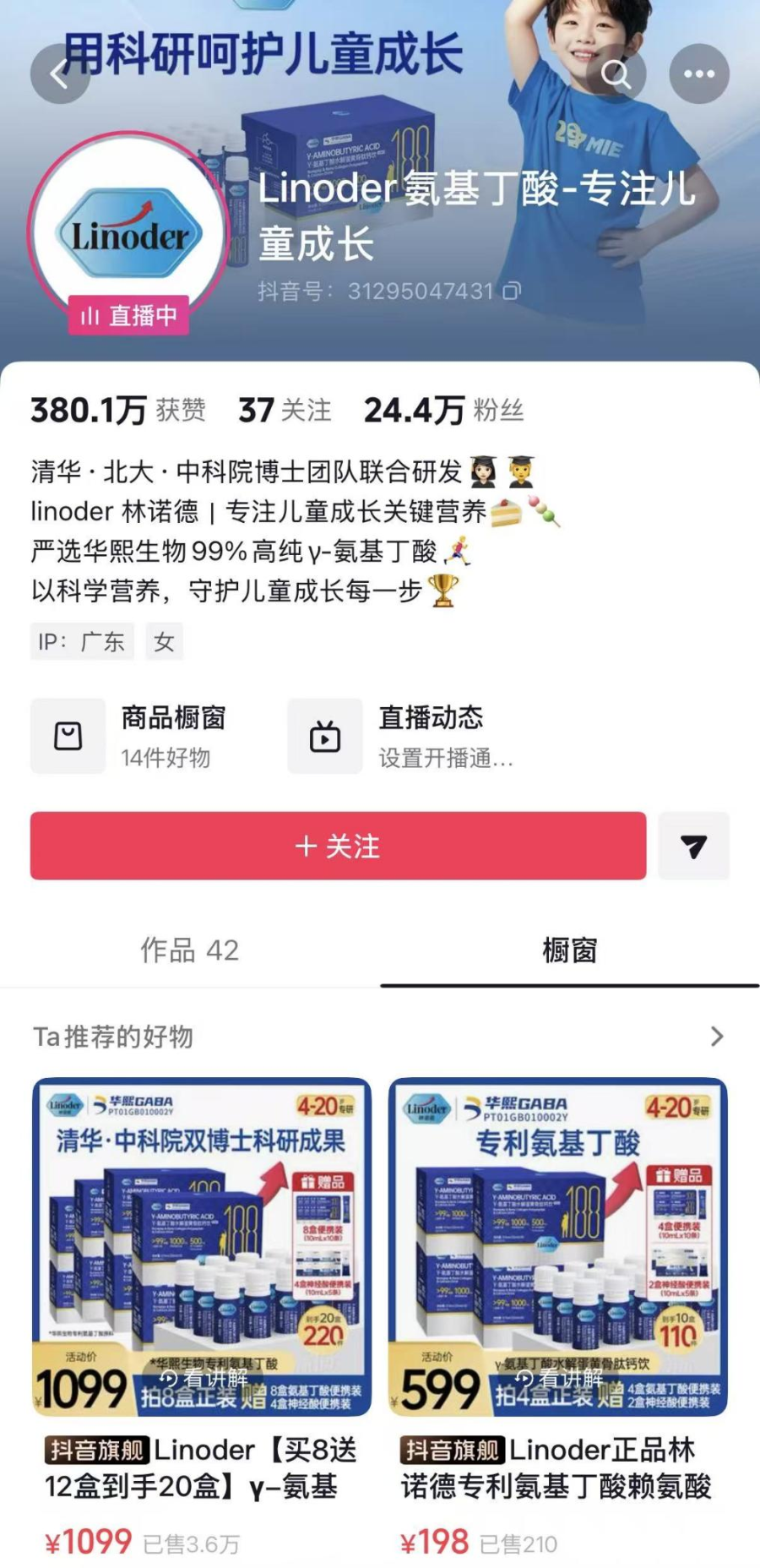 不过21世纪经济报道记者发现,目前在抖音平台,仍有“Linoder氨基丁酸-专注儿童成长”的账号在播,主播围绕“注重孩子成长所需营养”展开话术,γ-氨基丁酸产品定价为10盒599元,账号首页也仍标注着“清华·北大·中科院博士团队联合研发”的字眼。