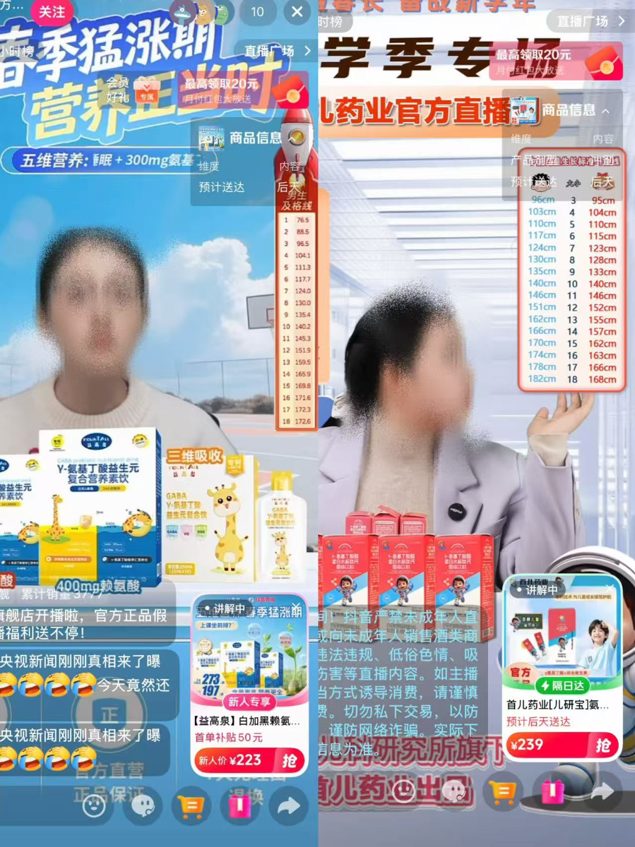 事实上,在抖音平台搜索“氨基丁酸”相关直播间,记者发现不少商家在直播过程中很少直接提及“长高”二字,而是围绕“睡眠质量决定生长激素分泌”“给孩子补充足够的营养物质”等展开话术。此外,直播间背景板上会醒目张贴“儿童身高百分位曲线图”“0-18岁身高发育标准表”,用视觉符号隐晦传递“助长”暗示。