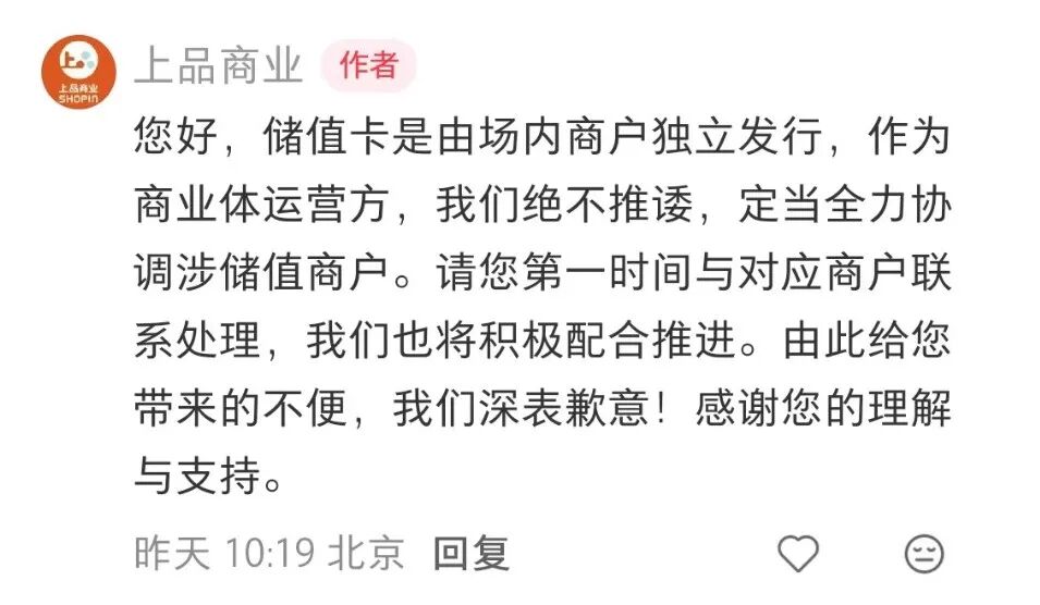 上品商业并未回应具体商户关闭情况,但对储值卡相关问题,上品商业回复表示:“储值卡是由场内商户独立发行,作为商业体运营方,我们绝不推诿,定当全力协调涉储值商户。请您第一时间与对应商户联系处理,我们也将积极配合推进”。