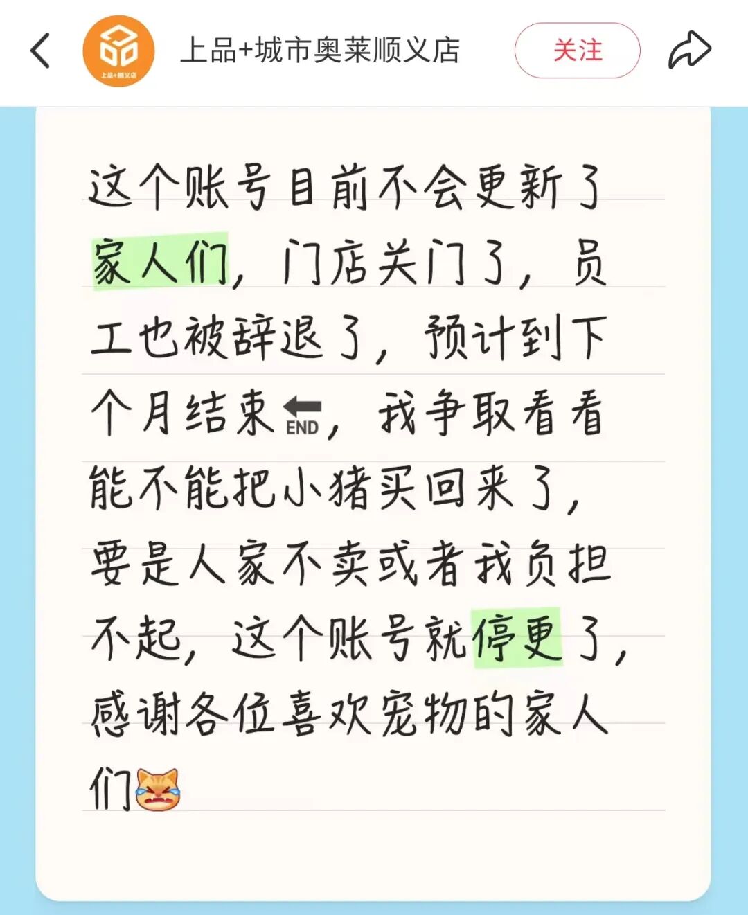 另外,上品+城市奥莱顺义店官方账号也发布消息称:“这个账号目前不会更新了,家人们,门店关门了,员工也被辞退了,预计到下个月结束”。